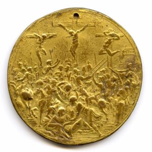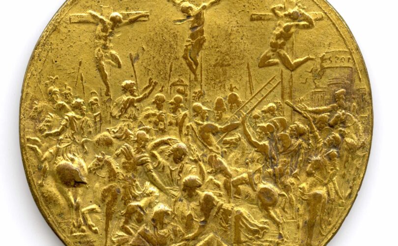 Si delinea poi un altro aspetto legato all’ambito squisitamente artistico che consente, talvolta, di mettere in dialogo medaglie e monete con altre forme artistiche attraverso la traduzione di modelli e soluzioni compositive di opere molto note, adattate alle ristrette dimensioni dei tondelli metallici. È il caso di Giovanni Bernardi (Castel Bolognese, 1494 – Faenza, 1553), che traspose nella medaglia qui esposta la composizione della Crocifissione già incisa per uno dei nove medaglioni in cristallo di rocca commissionati dal cardinale Alessandro Farnese (Valenzano, 1520 – Roma, 1589), di cui parla anche Giorgio Vasari, oggi conservato alla Bibliothèque nationale de France a Parigi.