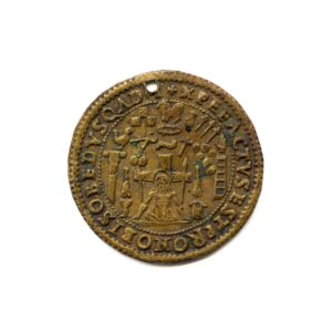 Le medaglie raffiguranti la lavanda dei piedi ricordano il gesto d’umiltà e l’esempio che Cristo volle lasciare ai suoi discepoli in occasione dell’ultima cena, rievocato nella messa del giovedì santo celebrata prima della Pasqua. Questa iconografia si diffuse a partire dalla metà del XVI secolo, non solo a ricordo dell’episodio evangelico ma anche con l’intento di rafforzare e ribadire la centralità del rito nella liturgia post tridentina in opposizione alle critiche mosse dal Protestantesimo.