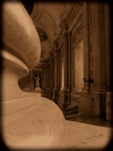 Datazione: seconda metà del Settecento. Visuale dal peristilio centrale superiore interno con la statua raffigurante la “Verità”, realizzata da T. Solari (scultore; n. Genova, ? – m. Caserta, 1779) sullo sfondo.